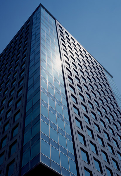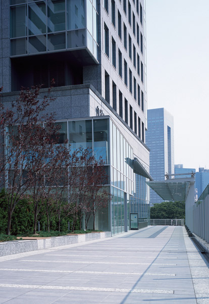 芝離宮庭園に隣接するオフィスビルです。コーナーガラスCWと石打込PCa板で構成したハイブリッドな外装により、質感のある端正でシンボリックな外観を実現しています。オフィス空間は機能的で使いやすい無柱整形空間とし、天井高さ3m、眺望を生かした隅柱の無いワイド開口で快適性を高めながら、基準階有効率79%確保しています。コ・ジェネ、氷蓄熱、自然換気、ペリメーターエアフロー、昼光利用の省エネルギー技術を集約し、CASBEEでSランクの評価も達成しています。足元にはガラスキャノピー付の歩行者デッキを配し、汐留街区の公共空間に貢献しています。