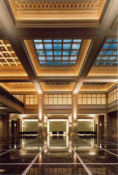 昭和9年竣工の重要文化財「明治生命館」を、現代のオフィスとしての機能を確保しつつ、将来に亘って使い続けるための大規模な改修です。 お堀に面した外観、1,2階の営業室と廻廊や会議室、最上階の講堂等の様式的な内装は、現代の技術を駆使しながら、補修、修復、化粧直しを全面的に行いました。、事務室部分はテナントビルとしての機能確保を主眼に、1階や地階は、より多くの人に親しまれることを目指し、ラウンジやレストラン機能への改修を行いました。機能や用途を更新しながらも、既存の空間をより魅力あるものにしています。