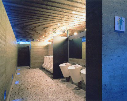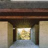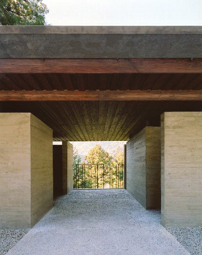 江戸時代より消失していた身延山久遠寺の「五重塔」復元工事の着手を機に、本堂周辺の再整備が必要となり、参詣者のためのトイレが計画されました。杉木立の森のなかに建つこの施設は、杉板の肌理を写した本実型枠によるコンクリート打放しの外壁の上に、伝統的な瓦屋根の軒廻りの意匠をモチーフとした厚板鉄板が水平に浮いたシンプルな構成としました。瓦・木・漆喰・石で構成される隣接堂宇との素材とかたちの緩やかな調和を目指しました。