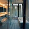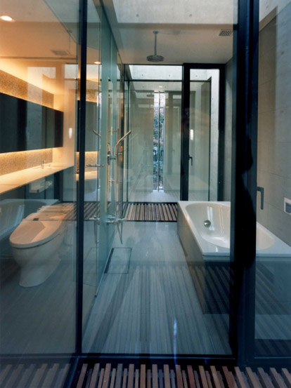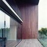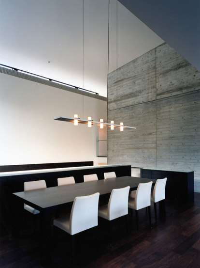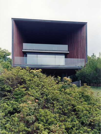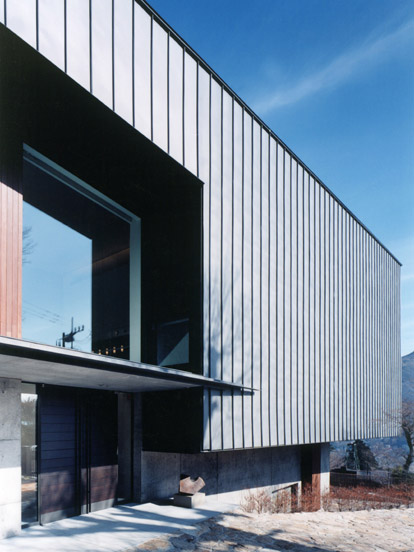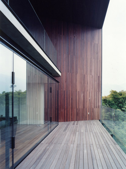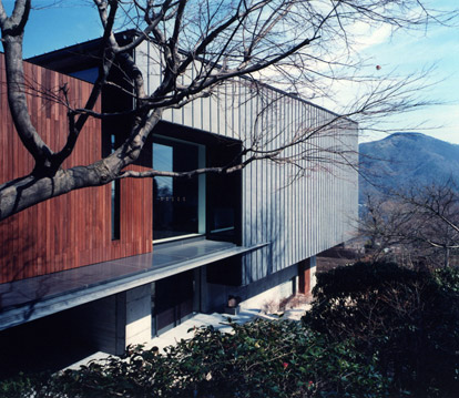 敷地は山並みを臨む眺望が開けた傾斜地です。環境、地勢に調和させることをテーマに「傾斜地」「眺望」という敷地の特徴を生かしてデザインしました。オープンな3層の空間とプライベートな性格の2層空間を、傾斜に合わせ半層ずらして配置し、空間に繋がりと変化を持たせています。宙に浮かぶリビングは眺望に開かれながら軒の深い落ち着きのある空間となっています。通風、採光に配慮し光庭や開口部に環境との接点を丁寧にデザインすることで快適な空間を創りました。