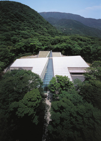 「箱根の自然と美術の共生」をコンセプトとして掲げ、本来この土地が保有していた植物生態系を極力損なうことなく、どのように美術館建築が自然環境と共存するかが設計の課題であった。広大な敷地内の動植物や地形、地質、水流の調査を詳細に行い、沢や谷を避けた、最も影響の少ない位置に美術館を配置し、地上部分の高さを8mに抑えて木々の間に隠れるように計画した。また完全免震構造によって建築を円形壕から浮かせることで、人と美術品を地震や高湿度から守り、将来にわたり建物のすべての部位にアクセスすることが可能な永久メンテナンス建築とした。アプローチブリッジからガラス張りのエントランスホールに足を踏み入れると、大きなガラス面を通して左手に小塚山の風景が開け、さらに地下2階まで吹抜けたアトリウムロビーが見渡せ、初めて訪れた人にも一目で美術館全体の構成が把握できるようになっている。