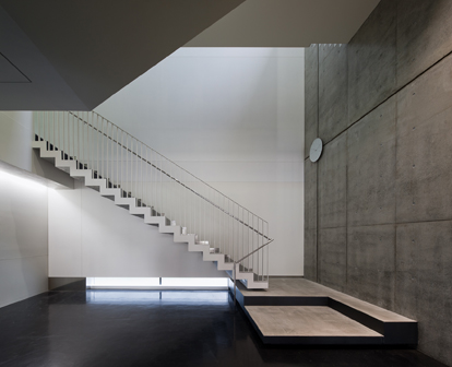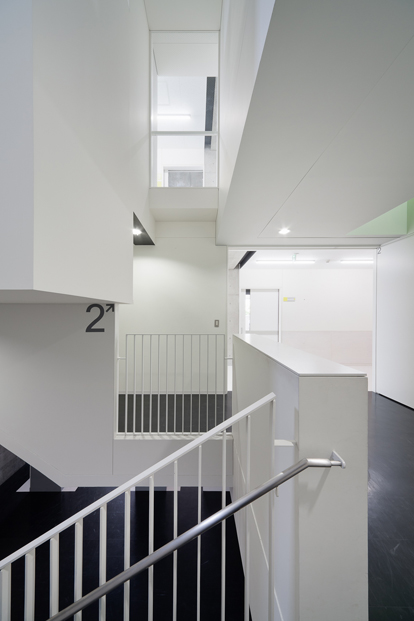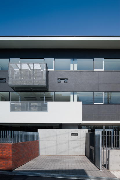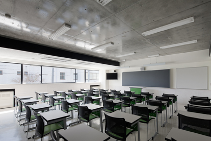 調理師養成・情報教育の為の専修学校新校舎です。周辺環境に応答し近隣住宅に接した3面はRC壁構造、既存校舎に接する南面は小径柱で構成し、開放感を高めると共にバルコニーに室外機を配置し、騒音低減とデザイン性を両立させています。教室は日影規制に抵触することなく3層確保し、閉塞感をなくす為に直天井仕上としました。共用部は3層吹抜の階段室やアルコーブを設置することで明るく豊かな教育空間を実現しています。