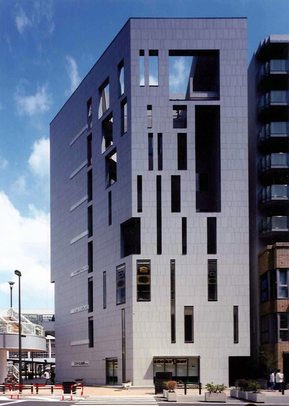 南柏駅前のクリニックビルです。ランダムな開口が穿かれた石壁により、周辺のパッチワーク状の商業施設ファサードと協調しつつ独自の象徴性を醸出しています。力学的整合性を配慮して開口配置を決めた石壁は、一体として強固な構造壁の役割を果たし、石壁内側にポラリス状に外部ヴォイドを内包しながら、各階毎に変化のある無柱整形のテナントスペースを生み出しています。石壁は同時に、西日の遮蔽、プライバシー制御、吹抜による容積調整による周辺建物との協調等、環境的な解答としても機能しています。