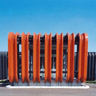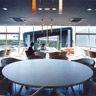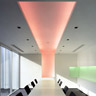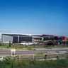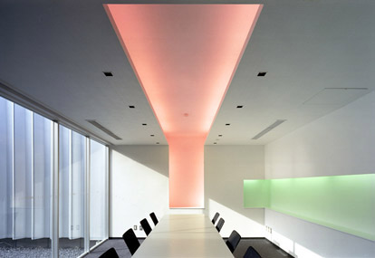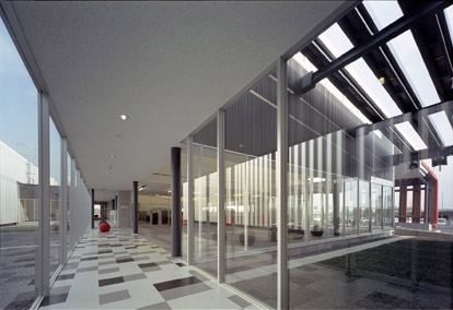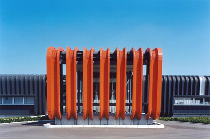 シャッター開口の大きな配送センターにとって、風のコントロールは重要な設計要素です。本計画では、この地域独特の季節風「赤城オロシ」への対策が求められ、ここでは、「風紋=風が創り出す風景」というコンセプトを導いています。風の存在を可視化すべく、屋根と外壁はラジアル加工によって滑らかに連続し、風の流れをストライプ・モチーフに置き換えたアプローチ空間と一体となってシームレスなランドスケープを構築しています。