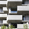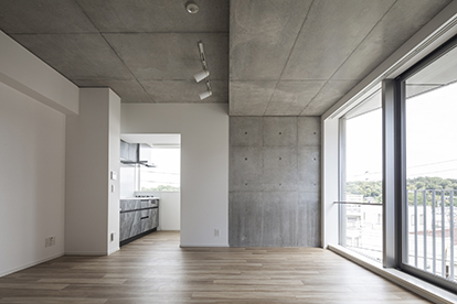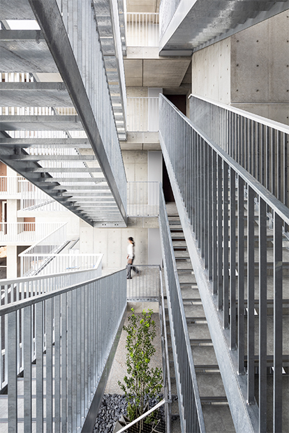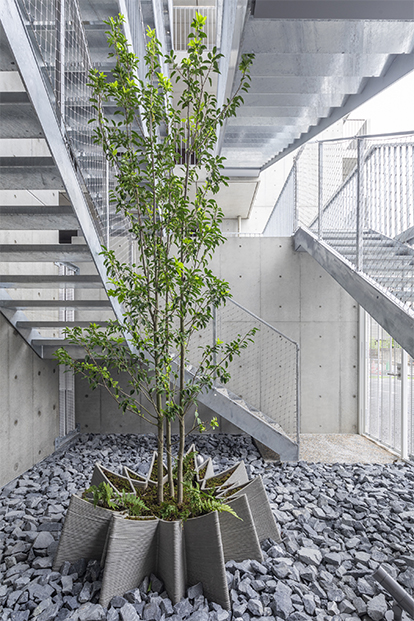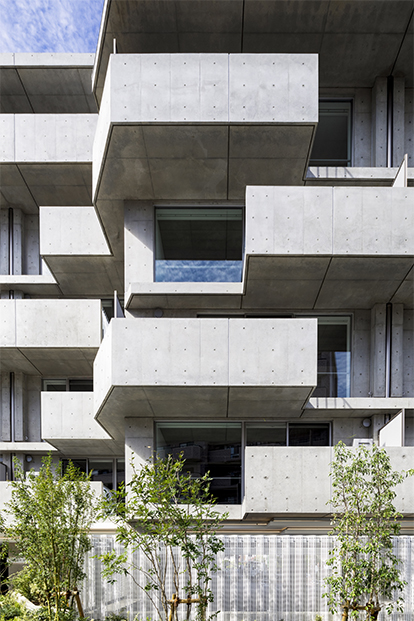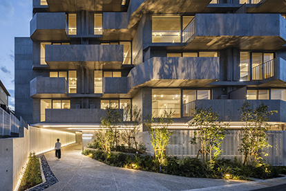 旧団地や緑地が残る街において、これからの街並みを先導するよう計画された集合住宅※です。コンピューテーショナルデザインによるボリュームコントロールやRC扁平梁の採用により、容積や採光・眺望を最適化しています。外装はコンクリート打放しによる素材感を活かした仕上とし、各所に組み込んだライン照明が夜景を演出します。中庭のシンボルツリーを支えるプランターの造形には3Dプリントを用いるなど、新しい技術にも挑戦しています。