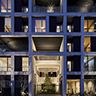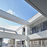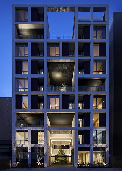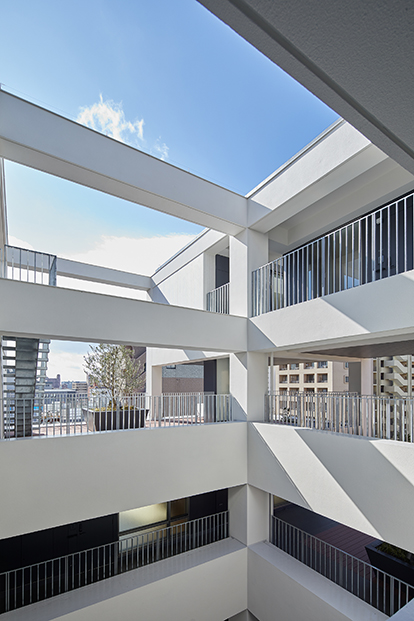 高層住宅が密集するエリアに建つ法人の寮です。建物全体にポーラスに配置されたテラスから寮全体に光と風を届けることで、開放的な住環境を実現しています。高強度コンクリートで作られた白いフレームは見付け寸法490mmのスレンダーな架構としており、グリッドの中でテラスと寮室が立体的に絡み合い、住人同士の距離感を選択できるコミュニケーションの場として活用されています。