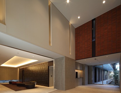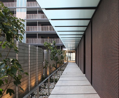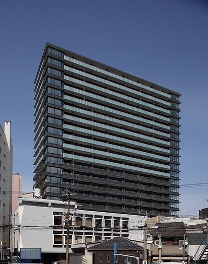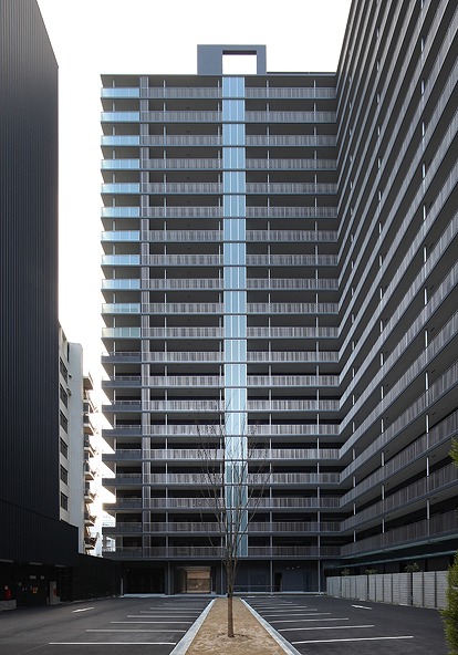 大阪梅田駅徒歩圏に建つ集合住宅です。都心居住者の求める美意識・こだわり、都市との心地よい距離感、街並みをリードする佇まいの創出を目指しました。L型配棟において、2棟に分割してエキスパンション・ジョイントで接続する通常の設計方法ではなく、免震構造を活かし一体で設計する「竹中Vフレーム免震構造」により、連続戸境耐震壁を効果的に効かせ、地震時の建物の変形を抑え、住戸内の梁断面も小さくすることができ、安心・安全の確保、眺望・通風・採光の向上、都会的で存在感のある外観を創出させることができました。