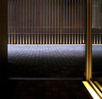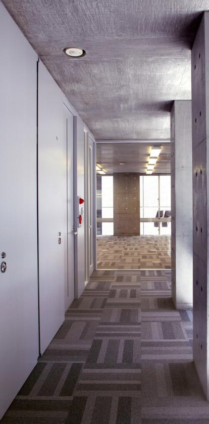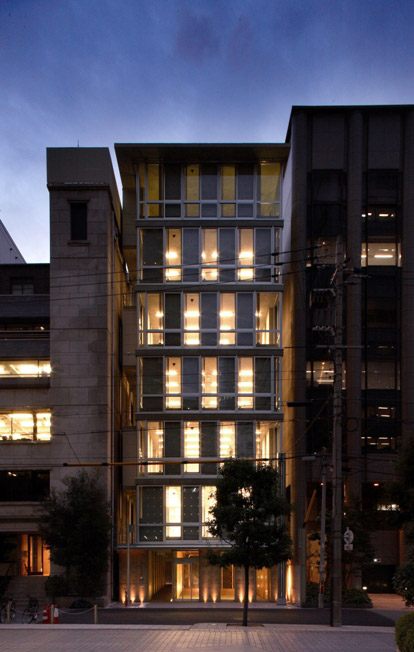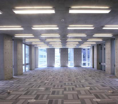 大阪の都心の北区堂島に建つ小規模のテナントオフィスビルです。一見揺らぎながら立ち昇る外周のRC壁構造体だけで、重力と地震時の水平力に抵抗させています。壁の外側にはサッシを配し、結果壁の断熱材は不要となりました。RC壁のセパレータの穴は貫通しており、光を通します。更に引き違いサッシは全てが開放可能で、風をも導き入れることができます。間口8mのスパンはボイドスラブでとばしており、室内には柱型も梁型も一切出しません。床下のOAフロアは350mmの深さをとり、空調・ワイヤリング・給排水までを全て床の下で解決し、室内のどの位置にでも水周りを設けることができる床下の設計を行いました。