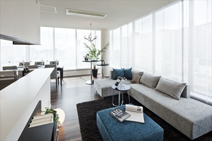 千里中央駅前再整備事業の最終プロジェクトとして、低層部に商業施設を併設した複合型集合住宅です。自然素材とアートで構成した共用部と、千里の伝統を現代的に再構築した「千里の庭」が、一体的で上質な憩い空間を演出します。高層部の住宅専有部は、細い柱とフラットな梁とすることで、水平基調の特徴ある外観と、開放的な住環境を実現、「永く心地よく住む家」の普遍解として次世代へと引き継がれる住まい造りを行いました。