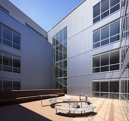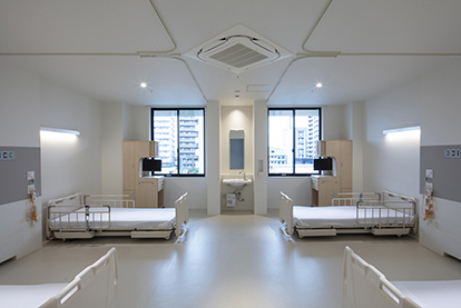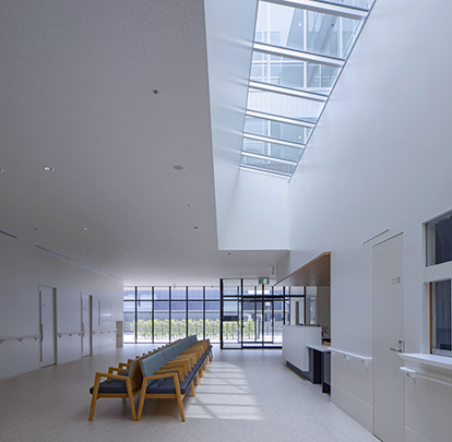 デイケアセンターを併設し地域密着型の高齢者医療を担う療養型病院です。患者さんや利用者、御家族が快適に利用できるように外来待合では自然光をふんだんにとり入れ、またデイケアセンターやリハビリ室は一体利用できる屋外の庭を設け建物全体を明るく開放感ある設えとしました。また病棟は中庭を介して患者さん見守りの容易な平面計画とし、病室に脱臭機構を装備するなどスタッフの働きやすい施設としました。