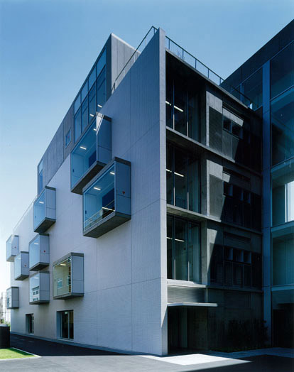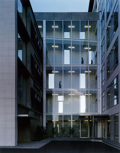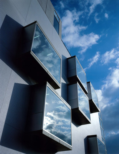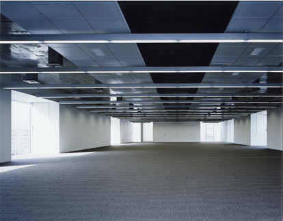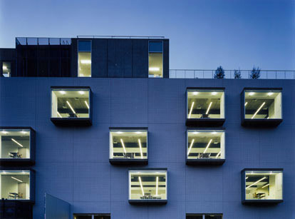 手狭になった既存オフィスビルの増築プロジェクトです。14m×35mのボイドスラブを用いた無柱のワンルームのワークプレイスをガラスカーテンウォールの廊下で結び、出窓のミーティングスペースを設けています。出窓は側面が開閉でき、ワークプレイスへの採光と自然通風を可能にしながら、インフォーマルでオープンなコミュニケーションを誘発する場所となっています。