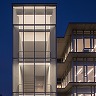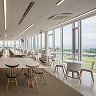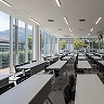 琵琶湖と比良山系を臨むキャンパスの中央に建つ新校舎です。眺望を最大限に活かすため、三方をガラスのスクリーンで開放的な外装としています。その中にウインドキャッチャーとなる換気窓を配し、山からの卓越風を効果的に内部に取込むと同時にファサードのアクセントとしました。インテリアは琵琶湖周辺の風景の色を抽出して壁や床に配色、湖面の波を表現した照明配置をするなど、この場所特有の自然を感じられる空間としました。