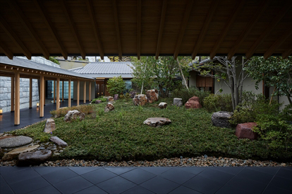 京都東山の風景を未来に遺したいという想いから、瓦屋根の町並みと重ね合わせた「瓦屋根の群としての風景」と建物と庭が一体と成す「庭屋一如」を目指しました。玄関にはおもてなしの空間としてプリツカーガーデン「叡心庭」を設けています。