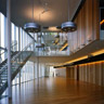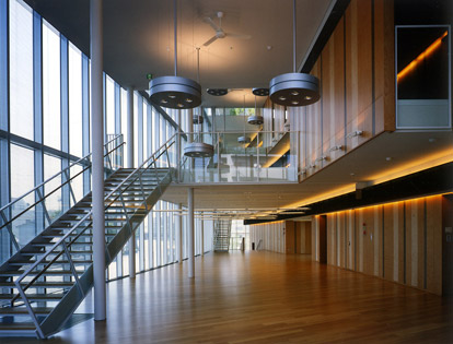 流線型状の敷地を積極的に活かして、川と道路に沿った曲線の外壁が周辺環境に馴染んでいます。また、企業アクティビティを発信する場を創出するため、構造形式にフラットスラブと小口径柱を採用し、西側の線状コアスペースに耐力壁、バックスペース、空調機械室を集約することで道路がある東面に対し内部空間の開放性を高めています