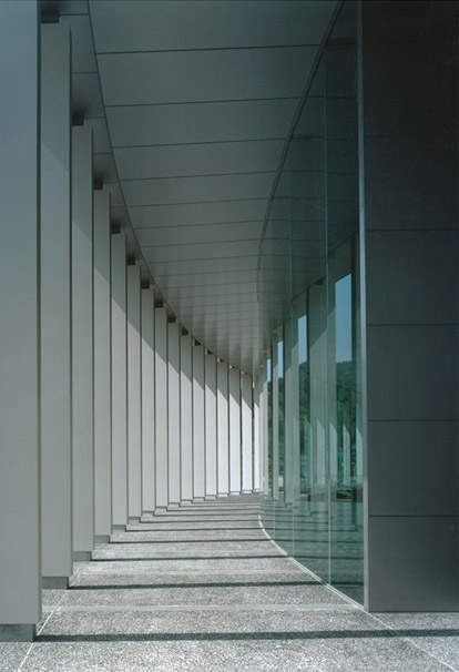 川崎学園創立30周年事業の一環として、学園創設者川﨑祐宣氏を記念した講堂。氏は、無から有へと未知の領域「医療福祉」を切り開く強い想念で、広い人間愛と「天に星・地に花・人に愛」という言葉を信条に、医療・福祉・教育に生涯を尽されました。氏が遺した心を受け継ぎ新しい生命の創造を目指す人々が、扇のように両手を広げ誘われる空間になるよう、万人が普遍に享受できる“光・緑・地”をテーマに、建築・設備・構造の統合を意図しました。ルーバー柱で広がりを得たロビーと回廊やテラス、プラザと外部のグリーンベルトをランドアートと共に一体的に整備し、社会に開かれたキャンパスとしての多元的な内外環境を創出しました。自らの強い想念のもとに集う人々に、無から有へのまなざしを育み培う環境として、初めてこの建築は現れます。