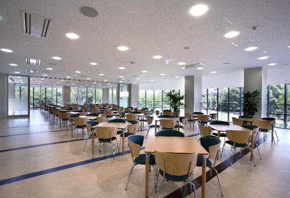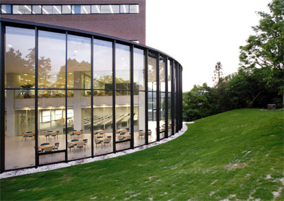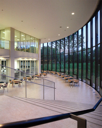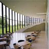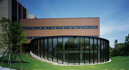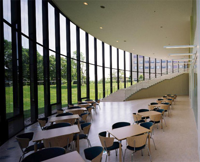 他者へのまなざしがその行為の原点であろう医療や福祉。この医科大学の校舎増築では、大らかな緑の丘陵「ふるさとの森」に円弧のラウンジ部を張り出し、自然界との間に吹抜を抱く構成としています。そのことで生れた自然界への幾重もの多様な空間へ自ら歩み、自然からのより強い啓蒙を他者へのまなざしに昇華できる医療人を育む環境創りを意図しています。