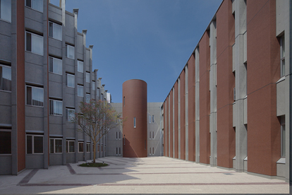 津軽医療圏における脳卒中後遺症患者増加を受け、2005年完成の既存棟145床を計248床に増やしました。極寒多雪の風土にあって、レンガ調タイルとRC打放しを組合せた彫りの深い表情は、深雪の中に凛と立ち来訪者を温かく出迎えるとともに、雪害対策・日射制御等の環境性能も備えます。円筒階段が象徴的に佇む中庭、静寂感のあるレストラン、柔らかな光溜りをもたらすハイサイドライト等、温かい情景が溢れる療養空間を創り出しています。