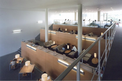 福島県の高台に建つ、私立大学のキャンパス中心部にある既存図書館に増築された、新たなキャンパスのシンボルともなる学習センターです。従来の閲覧機能に加えて学生達が自由に学習・討議できる空間を創るとともに、学生達の行き交う活気のあるキャンパス空間を創出することを意図しました。