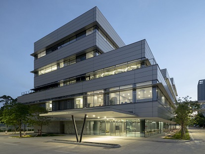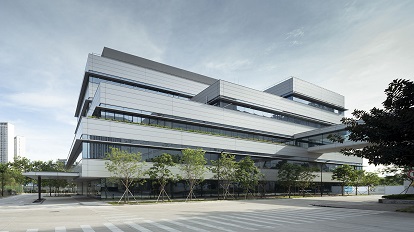 工場敷地内に分散していた事務厚生機能を集約した新棟です。“Innovator in Electronics”を目指す建築主の想いを受け、「Murata ワク沸くラウンジ」をコンセプトに、心沸き立つクリエイティブな空間を目指しました。建物ボリュームを段状にセットバックさせ、生じた屋上テラスを積極的に緑化することで環境性能を向上しつつ、工場入口からの視覚的な圧迫感を軽減して、“街に開かれた工場”としています。