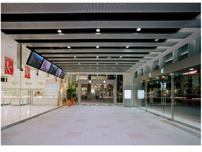 外観は金属とガラスの単純な構成としながら、1,2階及びコ-ナ-部を透明ガラスとすることによって、街並みに賑わいと華やかさを演出しました。特に1階メインの風除室は約120㎡のスペ-スを持ち、イベント、展示、ワゴンセ-ルあるいは発表会等多目的に利用できる空間としています。街並みに対して情報発信をしながら厳しい冬の寒さからも人々を守るスペ-スとして利用されることを願っています。