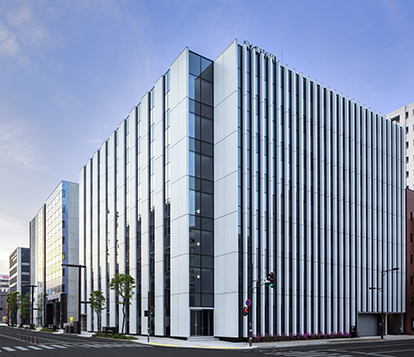 北海道神宮の表参道である北1条通りに面するオフィスです。由緒ある通りに相応しい佇まいを目指し、縦リブが連続する彫りの深い外観としています。道産の石材や塗材、現地の粘土を焼成したレンガを用いた地産地消のものづくりとし、基準階はレンタブル比86.5%、奥行19.2mの大スパンとし、自由度が高い無柱空間を実現しています。環境負荷の低減としてエコボイドの導入、井水の中水利用、ダンボールダクトを採用しました。