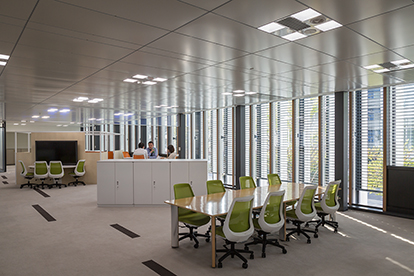 2003年竣工の当社支店に対して、日本初の試みとなる既存オフィスを稼働しながらのネットプラス・エネルギービル(ZEB)化改修を行いました。外装のダブルスキン化、太陽熱・地中熱利用等の最新省エネ技術の適用に加え、室内快適性のあり方・働き方といったソフト面の見直し、個人の活動状況や好みに合わせて室内環境を制御するウェルネス制御を採用し、ZEB化普及に向けて風穴をあける取り組みを試みました。