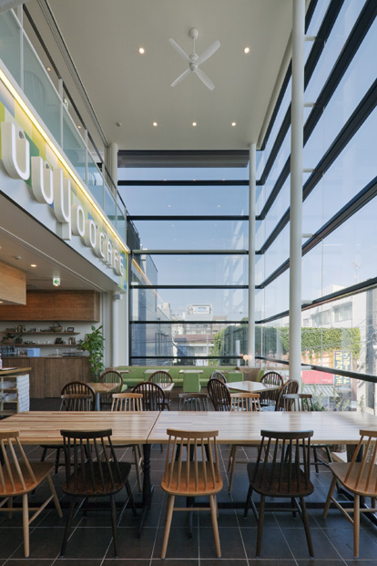 また各々のテナントスペースには配置に応じた空間的特徴を付与しており、特に駅前側2階には大開口を持つ吹抜け空間を配して、舞台性のある特徴的な空間を創出しています。