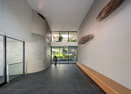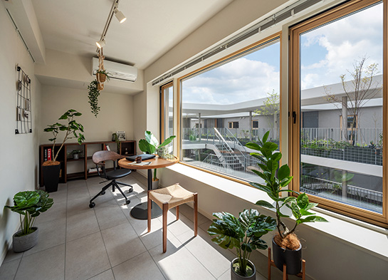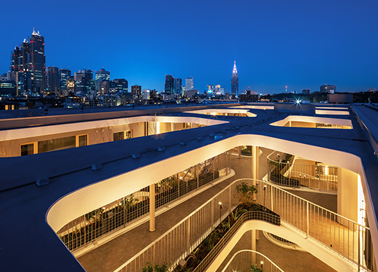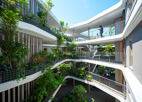 都心の閑静な住宅街に建つ86戸の賃貸集合住宅です。脱炭素社会を見据え、入居者が快適に生活しながら省CO2に寄与できる次世代型健康住宅をテーマとしました。光・風・緑を取り込む開放的な中庭から各住戸への採光・通風を確保し、住戸の超高断熱化により住人のQOL向上を図っています。また、創エネ電力の地産地消を促進するシステムや高効率設備を導入することで、国内最高水準の省エネ性能を有する中層集合住宅のプロトタイプとなることを目指しました。