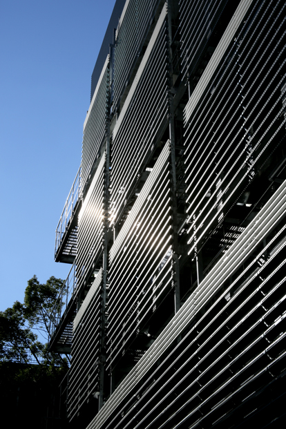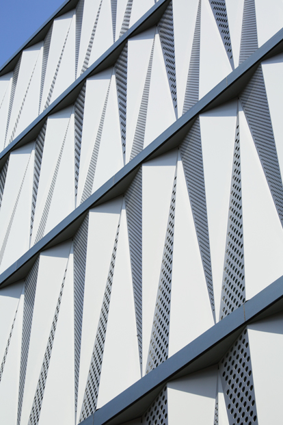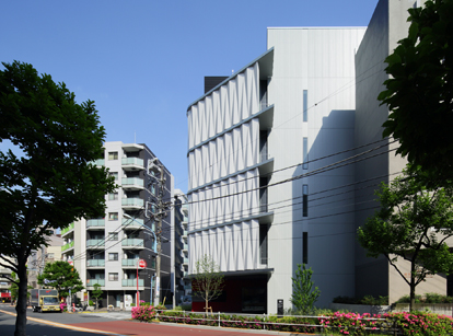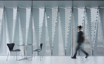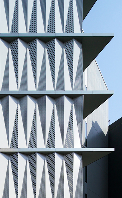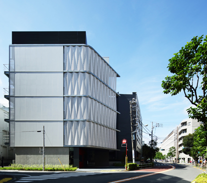 次世代型ネットワーク社会の実現と新産業創出を目指す研究拠点です。整形な実験空間と不整形な敷地に囲まれた領域を、研究者の新たな発想を誘発する豊かな場に昇華させることを目指し、スマートスキンと呼ばれる環境制御外皮で包みました。3種類の開口率を持つ三角形状パネルを組み合わせ、日射調整や視線制御により良質な環境を生み出すとともに、歩行時の振動加速度を1/2に低減する機能を併せ持たせています。