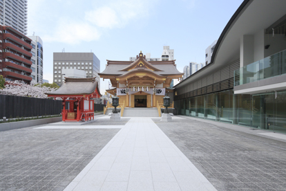 安産・子授けなどの御利益で知られる東京日本橋の神社「水天宮」の、江戸鎮座200年記念事業の一環として、境内を一新した御造替(ごぞうたい※建替工事)です。12日に一度巡ってくる戌の日や休祝日には多くの人が訪れるため、参詣者の安全・安心を第一に考え、境内全体を基礎免震構造(鉄筋コンクリート造)としました。社殿ではコンクリート躯体の内外に宮大工の伝統技術を活かし、白木の伝統木造様式を表現しています。
