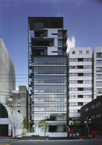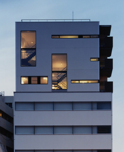 効率的でフレキシビリティの高いオフィスの上部に組み木のように交叉させたメゾネット形式とフラット形式の住戸を重ねています。住戸間には光庭を挿入し、ビル上層に路地を囲んだ小さな街並みを生み出しています。「遠望に開かれるビュー」と「路地を抜ける光と風」を楽しめる特徴ある住宅です。また、堀の深いその重なりが印象的な都市景観を生み出しています。