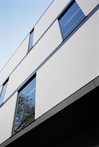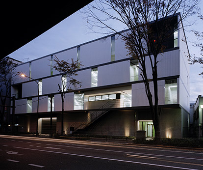 自動車部品共販会社の都心型モデル営業所です。限られた敷地の中で、諸室を上階に浮かせ、1Fを全面駐車場とすることで車両のスムーズな搬出入を確保しています。外装は40mの間口を生かし、連続性を強調した視認性の高いデザインを目指しました。フロアラインで挟んだ開口部を階毎にずらし、機能にあわせ上階に向けて窓を絞り込むことで、騒音を最小限にしながら、ファサードに車のもつ軽快さを与えることを狙っています。