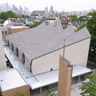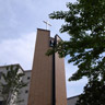築50年の聖堂と修道院を、聖堂と健診センターへ建替えた計画です。東側に既存病院、西側崖下に住宅地という敷地条件の下、西側が高い片流れの形態と既存のステンドグラスを再利用した西面開口部から差し込む光により、旧聖堂がもつ黄金色の空気感を再現しました。折り紙細工からヒントを得た、RC折れ屋根・折れ壁構造により柱・梁の無い大空間とシンボリックな外観を表現し、折れ屋根形状を直接顕わした内部は、天井の光と影が印象的な祈りの空間を創出しています。