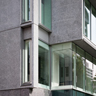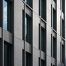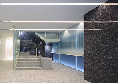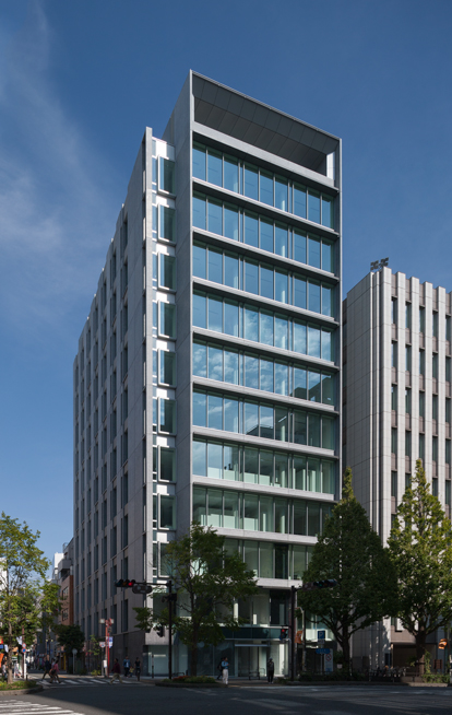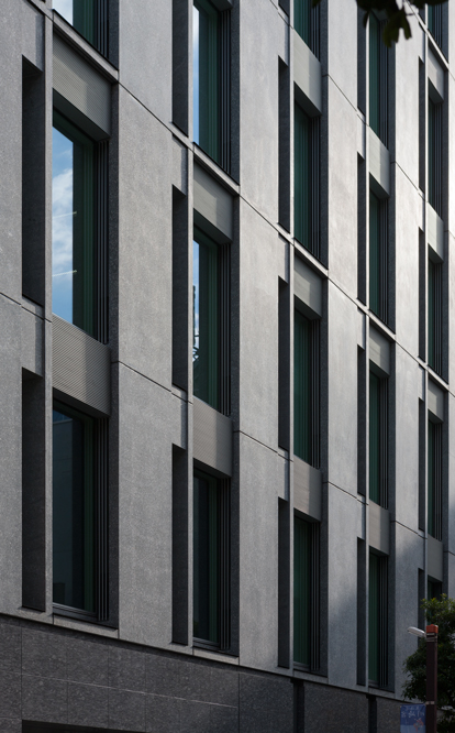 旧東海道川崎宿本陣に立地し、歴史と現代の賑わいが織り交る文脈を継承すべく、職人の手仕事を活かした質感と次世代オフィスビルとしての外装の融合をはかりました。制振構造とし、アウトフレーム架構の、自然換気や日射遮蔽等、構造・環境技術を統合する外装システムを開発することで整形で柱型のないオフィス空間を実現しました。仕上は天然石とコンクリートを研出し、研磨することで穏かな表情を創り出しています。