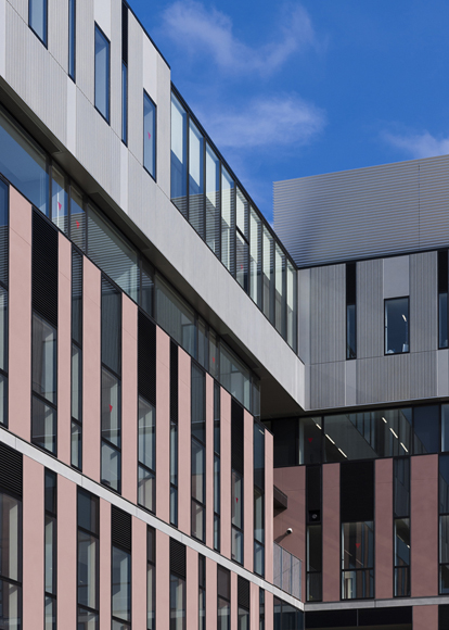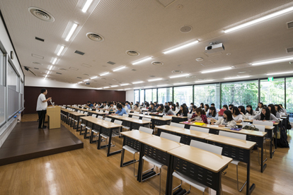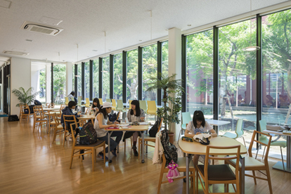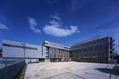 短大校舎を大学校舎敷地に移設新築する学園創立80周年の記念事業です。既存のプロムナードをキャンパスの中心軸として再整備することで四年制大学との連携を強化し、ラーニングコモンズやグループラーニングスペースを多数配置することで、学生の活動が敷地全体に広がる計画としています。敷地内に残る県文化財「煉瓦棟」を踏襲した暖色のキャンパスカラーや、優美な曲線で構成されたエントランスホール、各階に配置されたパウダーサロンなど、女性活躍推進時代の短大校舎に相応しい表現を目指しました。