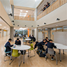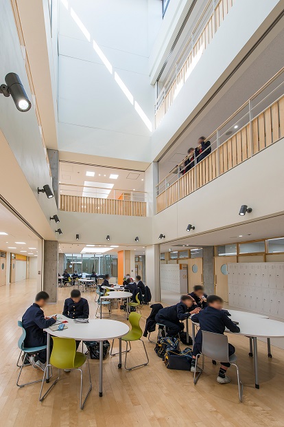 校内を南北に結ぶ「光の道」を設け、この両側に中学・高校棟を明確に分離して並列配置しました。高校への憧れを持ちながら中学生活が送れるように、高校棟で勉学する先輩たちの姿が垣間見える教室配置としています。高校棟ラーニングコモンズには吹抜・光庭といった各階を鉛直方向に結び付ける空間を設けました。他階にいる生徒・先生方との視線が交差することにより、活発な知的コミュニケーションが発生することを狙いとしました。