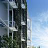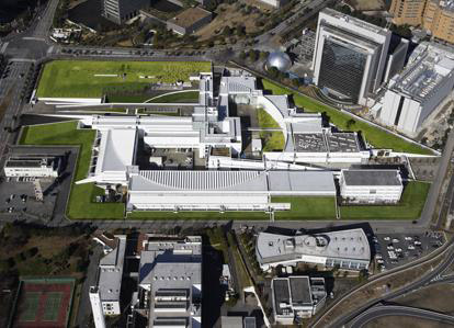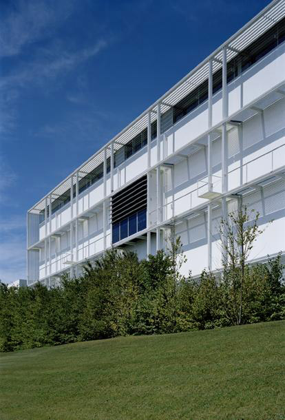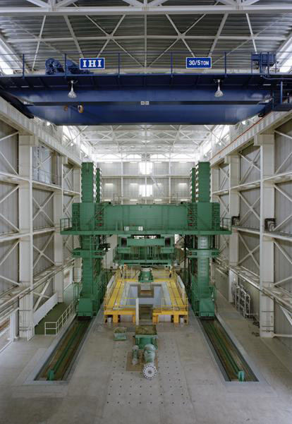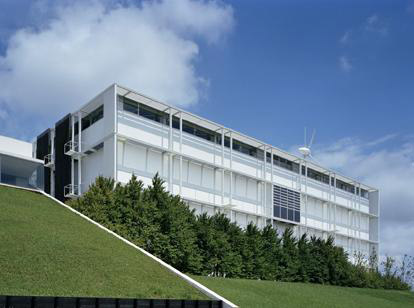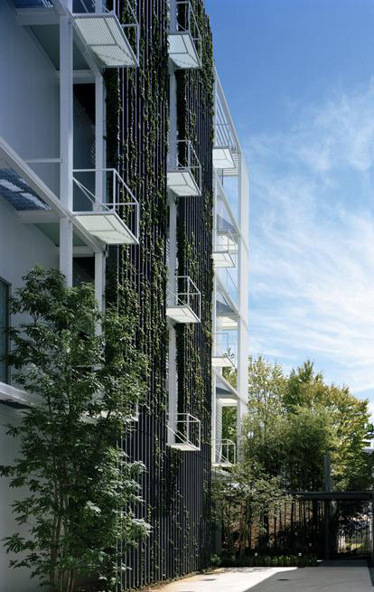 当社技術研究所の敷地南東端に建つ、国内最高能力の耐火実験装置を有する研究施設です。白を基調とした外壁には鉄鋼の「サステナブルフレーム」を設置し、研究所としての構えを表現しました。庇や足場、また構造要素としての水平梁の機能を持つこのフレームには緑化外壁、太陽光発電パネルなどの環境配慮技術を実装し、実験検証及び開発技術の展示場としての役割を持たせました。見学者を迎えるエントリーコートでは格子や庇に環境配慮素材を用い、「素材をあるがままに用い古びて行く様を愛でる」日本古来のサステナブルな思想を体現しました。