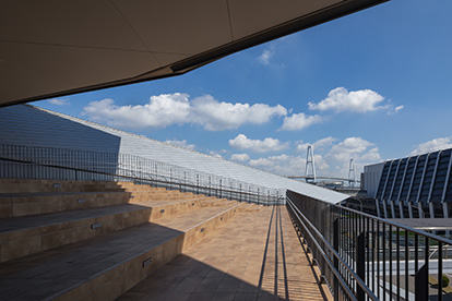 名古屋港からの輸出製品が地域経済を支えてきたという歴史的文脈を踏まえ、各施設へと人を渡す「船」をモチーフに外観をデザインしました。2階レベルで駅から連続する「にぎわいデッキ」とそこへ立体的に連続する「つながるテラス」の2つの動線が広場へと人々の流れを生み出し、地域のにぎわいを創出しています。