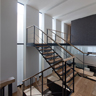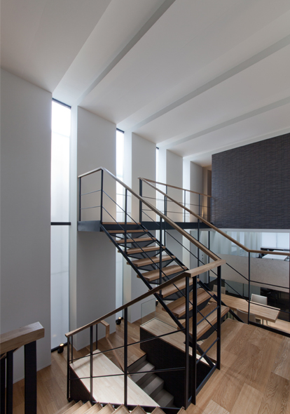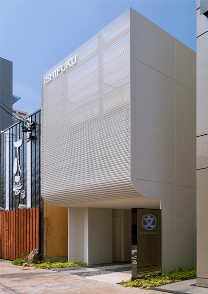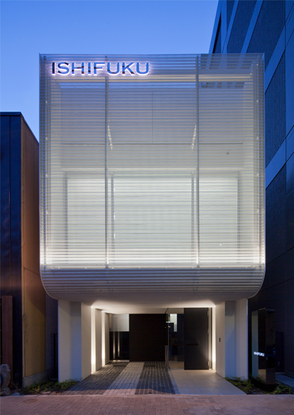 名古屋の水運を支えた堀川沿いの間口約6m、奥行約25m、高低差約2mの敷地に建つ貴金属取扱店営業所の建替計画です。波型有孔アルミパネルを建物の正面に纏わせ、企業の個性的な顔をつくると同時に防犯機能を両立させました。内部は「木」を用いて温かみや安らぎを感じさせる空間とし、更に敷地の高低差を生かすスキップフロアと吹抜けを組み合わせることで、コミュニケーションとアクティビティを誘発しています。