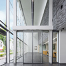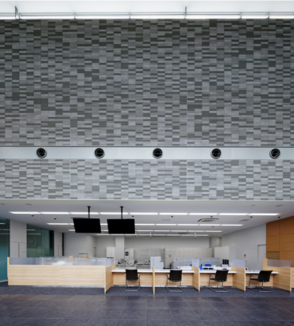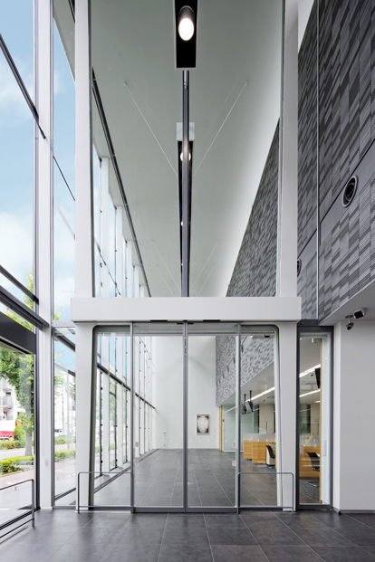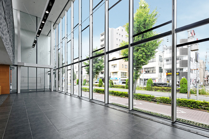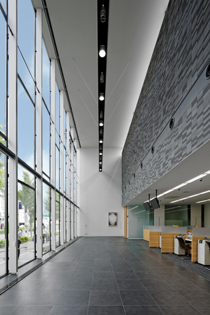名古屋駅の西側に計画された、信用金庫支店の建替え計画です。天井高さ10Mのロビーを全面ガラス張りとし、ミニマルで透明度の高い外観と、自然光にあふれる内部の心地よさを追求しました。建物をロの字型にフレーミングすることで、雑多な風景から縁を切り、信用金庫の存在感を際立たせることを意図しています。日が落ちると内部の光が街に溢れ出し、タイル張りの黒い箱が浮遊している様が浮かび上がり、個性的な表情を呈します。