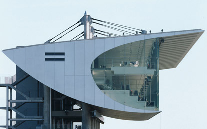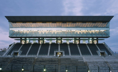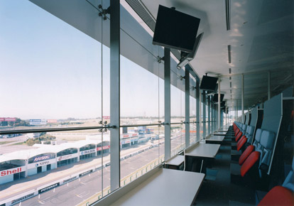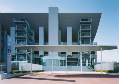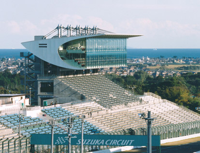 “観る”という機能をデザインモチーフに、鈴鹿サーキットの顔として建設されたVIPスタンドです。浮遊する2層構成のスタンドは、食事を楽しむテーブル席からも臨場感ある観戦を提供していています。乗り物のコクピットに搭乗するような空間構成で、“瞳”の部分に観覧席を大きくとっています。最良の視界を獲得するため窓際に主架構のない吊構造を採用し、フレームを3mピッチに設けることによって大空間にリズムを与えています。
