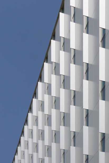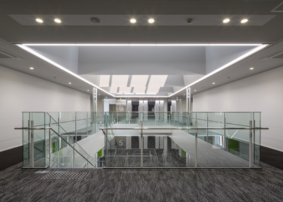 既設1号館(当社設計施工 2007年竣工)と渡り廊下で接続された医療系大学施設です。学園の教育理念の一つである「アセンブリ教育」のさらなる充実を目的とし、建物中央に学生や教職員の交流の場であるラーニング・コモンズと隣接して、機能、動線に応じて向き・位置が各階で異なる階段をもつ吹抜空間が配置されています。この空間が偶発的な刺激と自然発生的な相互啓発の触媒機能を果たすことを期待しています。