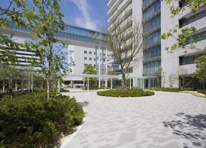 グローバル企業の本社正面に位置する、オフィスとイベントホールの計画です。「環境」と「コミュニケーション」をコンセプトに、CASBEE Sランクの達成や、広大なグリーンベルトの配置など数多くの環境配慮技術を盛り込み、また、オフィス内に設けられたコミュニティ階段などにより社内活性化を図るとともに、イベントホールやギャラリーを設置し、社外との積極的なコミュニケーションの創出を目指しています。