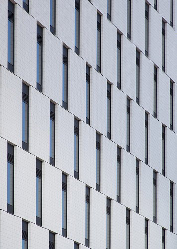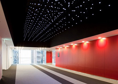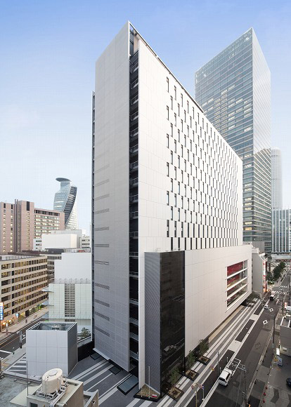 愛知県の産業労働支援機能を持ち、801席ホール、小ホール、展示室、貸会議室等、貸館事業を主体とした複合ビルです。窓は縦長ポツ窓とし、ガラス面積を抑え熱負荷低減を図るとともに、この窓を千鳥状に配列し愛知県の産業の出発点である繊維産業を象徴した「織物」を表現しました。また「労働」を示す「赤」が街区に滲みだし、開かれた施設を演出しています。