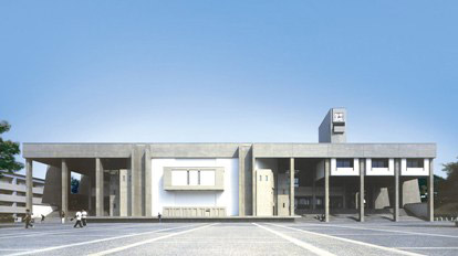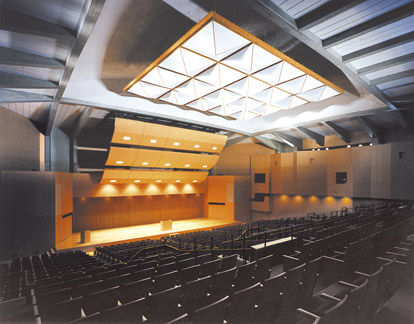 1960年に竣工した講堂が47年を経てリニューアルされました。外壁の復元にあたっては、劣化した表面を削り、耐久性の優れたコンクリートを打ち増し、特殊な表面処理などによって表情豊かな仕上げを実現しました。ホールは設備・音響などの性能をアップし、交流の場としてアトリウムを設け、隣接する小ホールと一体化した利用が可能になりました。