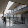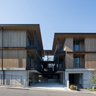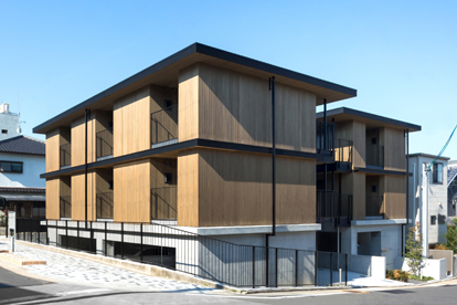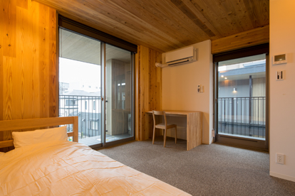 名古屋市内の閑静な住宅街に建つ、直交集成板CLT(Cross Laminated Timber)を用いた社員寮です。住居部分の壁・床を国産杉材を用いたCLTパネル工法とし、構造体であるCLTパネルを内装の壁・天井にあらわしにしました。中庭に向かって開放的な開口部を設けることで、寮生同士が交流を生むきっかけをつくり、風通しが良くCLTの木質を生かした内装により快適な住環境を実現しました。