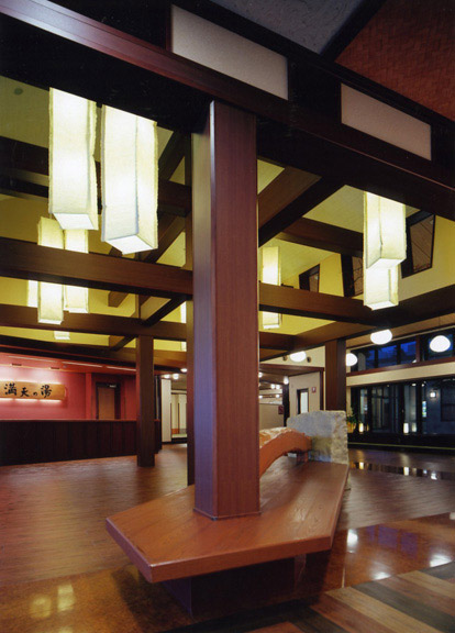 和風庭園露天風呂をテーマとした日本人の郷愁・情緒に訴える、地域性と華やかさのある温浴施設づくりを目指しました。機能毎に分節したヒューマンなスケールの建築群により、周囲に威圧感の無い景観構成としています。