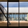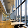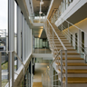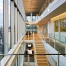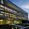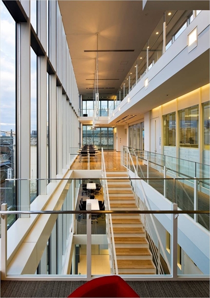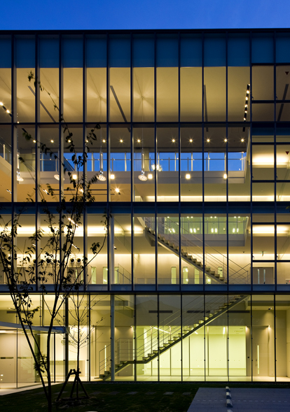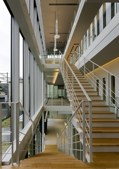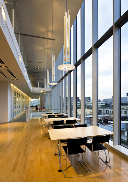 照明メーカーの研究所です。建物前面に「コラボフロント」と呼ばれる協業スペースを計画しました。ガラスカーテンウォールに包まれたコラボフロントに吹き吹けや階段を設け、外部に向かって開放的であると同時に内部の連続性と一体感が感じられる空間としました。ここでの社内外の壁を越えた積極的なコラボレーションを通じて、革新的で創造的なアイデアを生み出すクリエイティブな研究所を目指しました。