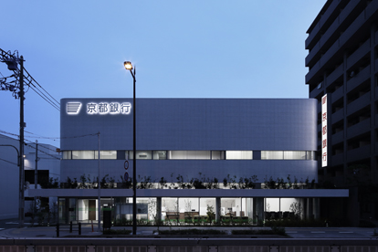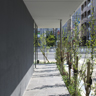 建物密集地でありながら「内外共に緑に囲まれた店舗」というテーマに対し、浮遊するバルコニーによる立体的な植栽構成で応えました。緑化バルコニーは1フロアと2フロアの中間に設ける事で人体スケールに近い緑の構成とすると共に、バルコニーの緑を内部からも見えるように計画しました。外壁は緑の映えるむくりのある白色の70角タイルを採用し、目地の目立たないシームレスな表現としました。