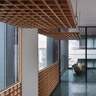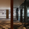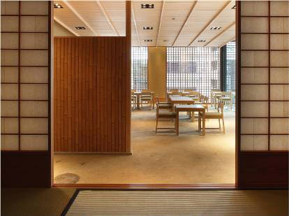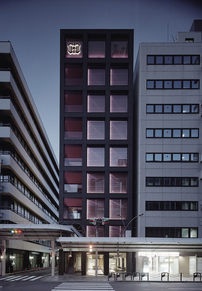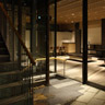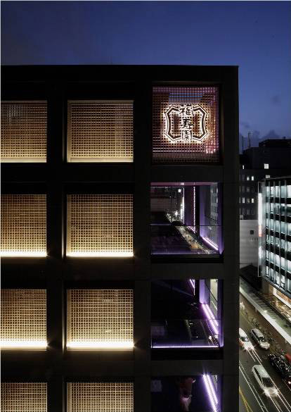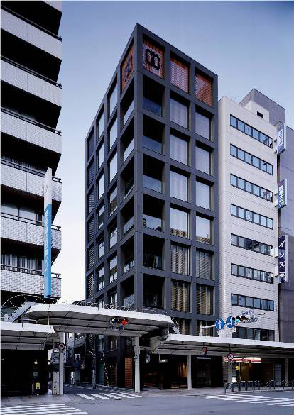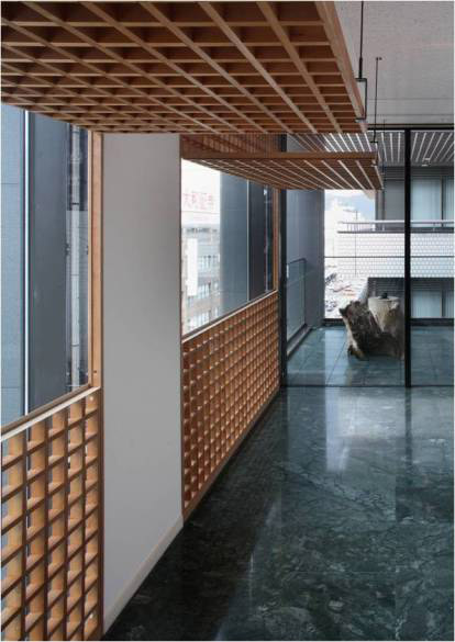 外観は黒色花崗岩の抽象立体格子デザインで、その内側にガラス 更には木格子が仕込まれています。木格子は室内側に対して蔀戸となっており、蔀戸を開けると屋内から京の風景を一望出来ます。一方 内部は床を石主体として外部に見立て、内なる庭としてデザインしています。格子・蔀戸・石・塗壁といった伝統的要素とガラス・シースルーEV・LED照明等の現代要素を同在させ、古さと新しさを同時に持ち続ける建築を目指しました。